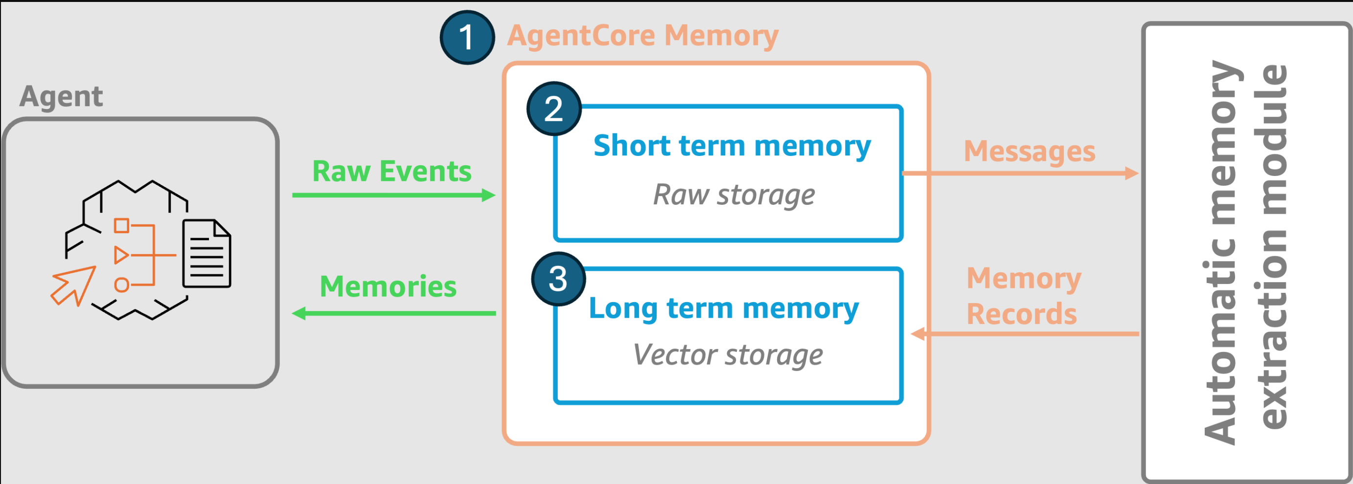 - Abstracted storage: AgentCore Memory handles the storage complexity for short- and long-term information, without requiring developers to manage underlying infrastructures.