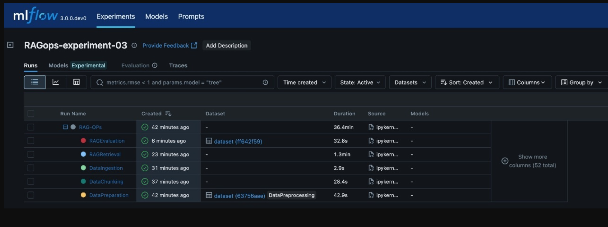 This visualization provides a clear, end-to-end view of the RAG pipeline’s execution, so you can trace the impact of changes at any stage and achieve full reproducibility. The architecture supports scaling to multiple experiments, each representing a distinct configuration or hypothesis (for example, different chunking strategies, embedding models, or retrieval parameters). MLflow’s experiment UI visualizes these experiments side by side, enabling side-by-side comparison and analysis across runs. This structure is especially valuable in enterprise settings, where dozens or even hundreds of experiments might be conducted to optimize RAG performance.