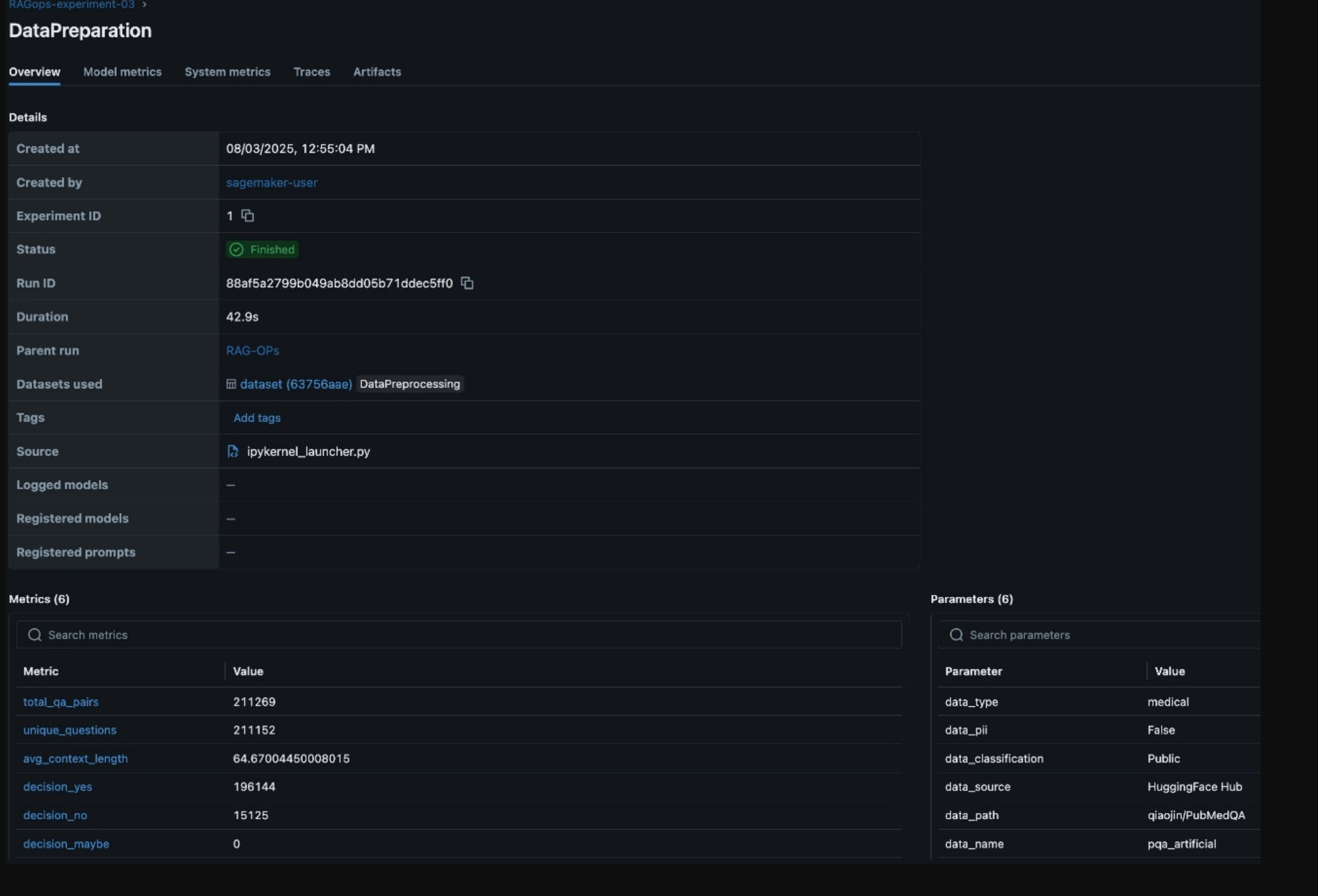 In the RAG workflow, rigorous data preparation is foundational to downstream performance and reliability. Tracking detailed metrics on data quality, such as the total number of question-answer pairs, the count of unique questions, average context length, and initial evaluation predictions, provides essential visibility into the dataset’s structure and suitability for RAG tasks. These metrics help validate the dataset is comprehensive, diverse, and contextually rich, which directly impacts the relevance and accuracy of the RAG system’s responses. Additionally, logging critical RAG parameters like the data source, detected personally identifiable information (PII) types, and data lineage information is vital for maintaining compliance, reproducibility, and trust in enterprise environments. Capturing this metadata in SageMaker managed MLflow supports robust experiment tracking, auditability, efficient comparison, and root cause analysis across multiple data preparation runs, as visualized in the MLflow dashboard. This disciplined approach to data preparation lays the groundwork for effective experimentation, governance, and continuous improvement throughout the RAG pipeline. The following screenshot shows an example of the experiment run details in MLflow.