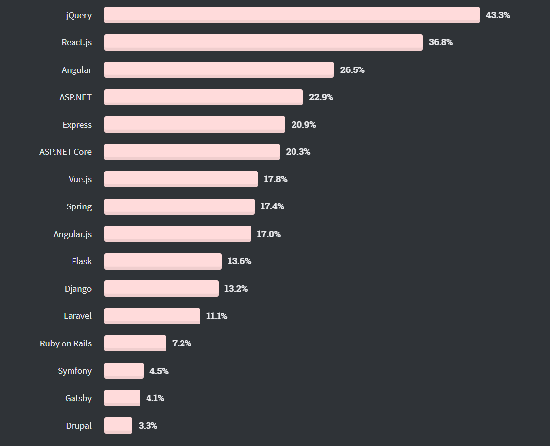 尽管今天有许多库,但调查结果证明Vue,React和Angular仍然是市场领导者。