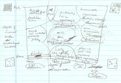 为了摆脱这种困惑,我决定尝试构建自己的决策支持模型。也许退后一步,独自思考这些问题,可以帮助我回过头来,理解另一个视角。我请莎伦(她的专业背景是水文学)帮我,我们两个科学家坐下来谈了几个小时,讨论复杂性、系统、社会和决策。我们问自己:如果一个人要帮助人们在很多情况下做决定,考虑什么变化轴是合理的?我们提出了两个我们认为最重要的轴:“强加秩序的程度”和“自我组织的程度”。我们绘制了一个二维空间,上面有这些轴的标签,并开始在上面的不同区域放置示例(法国大革命、公会、独裁、蜜蜂、滑轮等等)。我在这里展示的这个混乱的图表是我仍然拥有的少数几个版本之一(我似乎已经丢弃了其中的大部分注释)。