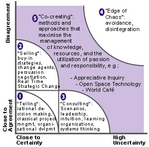 我的感觉是,通过这种方法,甚至可以将这种分析与Stacey的2x2矩阵联系起来。可预测性可能主要是连通性的函数,因此在可能连接数量更高的大型网络中更具问题。斯泰西的第二个维度达成一致的可能性可能进一步取决于行动者在特定网络结构中具有某种个人自主权的程度。