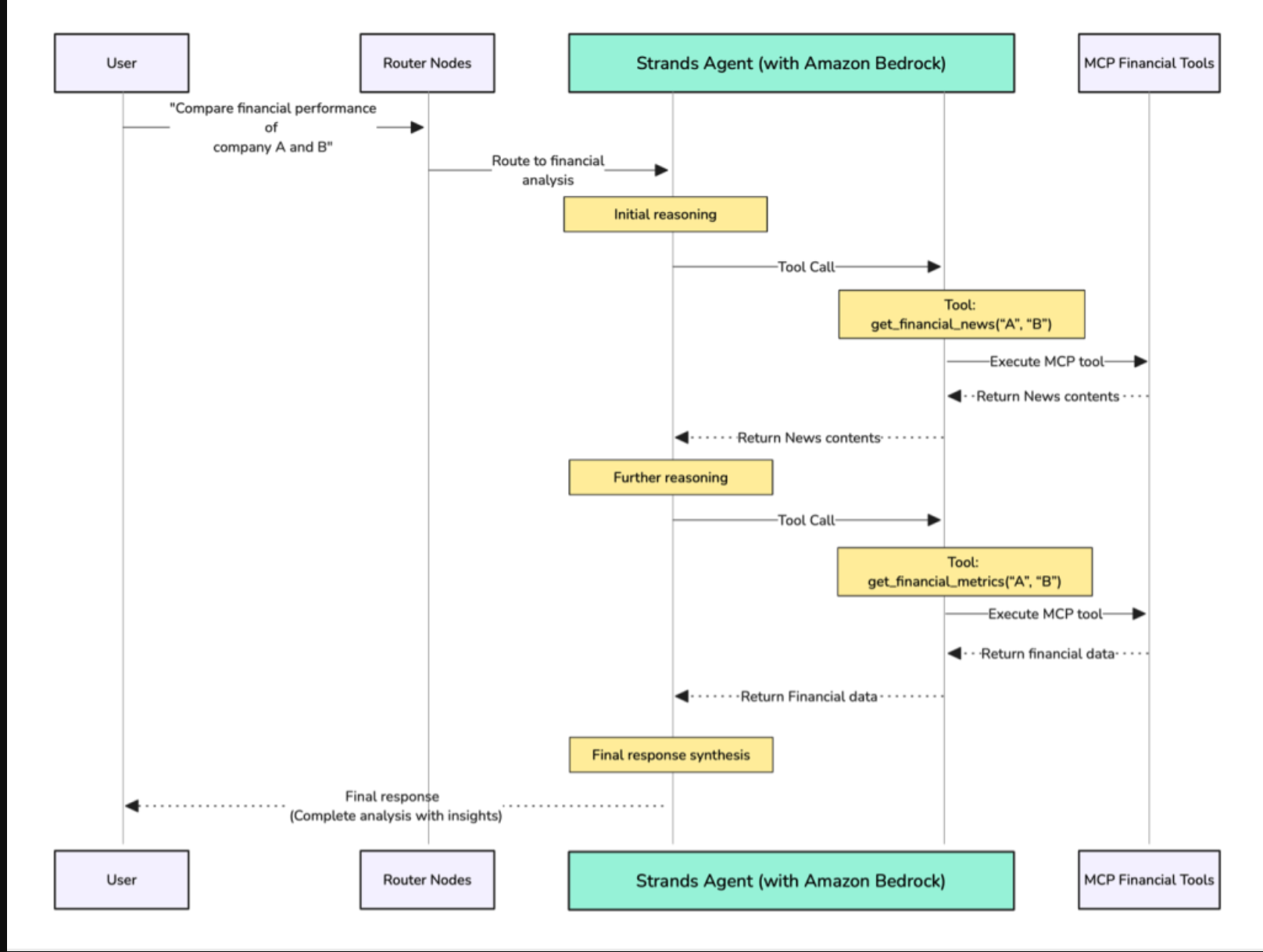 - Reasoning-tool execution cycles – The separation between reasoning (using Strands Agents) and execution (using MCP) creates a more modular system that mirrors how financial analysts actually work