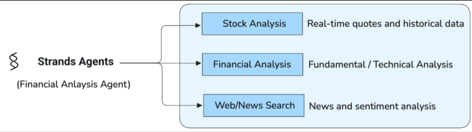 The combination of these frameworks serves distinct but complementary purposes in the architecture. LangGraph excels at orchestrating high-level workflows and directional processes, and Strands Agents optimizes autonomous agent interactions and decision-making at a more granular level. We used this dual-framework approach to make the most of the strengths of each technology: LangGraph’s structured workflow capabilities for macro-level orchestration, and the specialized handling by Strands Agents of agent-tool interactions. Rather than being redundant, this architecture creates a more robust and flexible system capable of handling both complex workflow management and intelligent agent operations effectively. This modular, maintainable system can handle the complexity of financial analysis while remaining flexible and extensible.