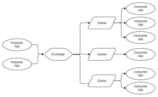 如您所见,发布者将其消息发送到同一个交换机(exchanges),该交换机(exchanges)将每条消息路由到三个队列,每个队列都有一个消费者。使用RabbitMQ,队列使不同的消费者能够使用每条消息。与下图对比: