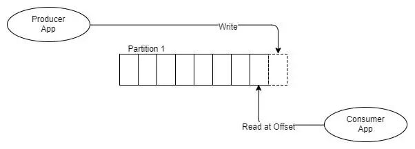 因此,让我们看一下具有单个分区和两个消费者的主题的情况,每个消费者都需要消费每条消息。从现在开始,我已经开始为消费者贴上标签,因为它不是那么清晰(如RabbitMQ图),它们是独立的,也是竞争对手的消费者。