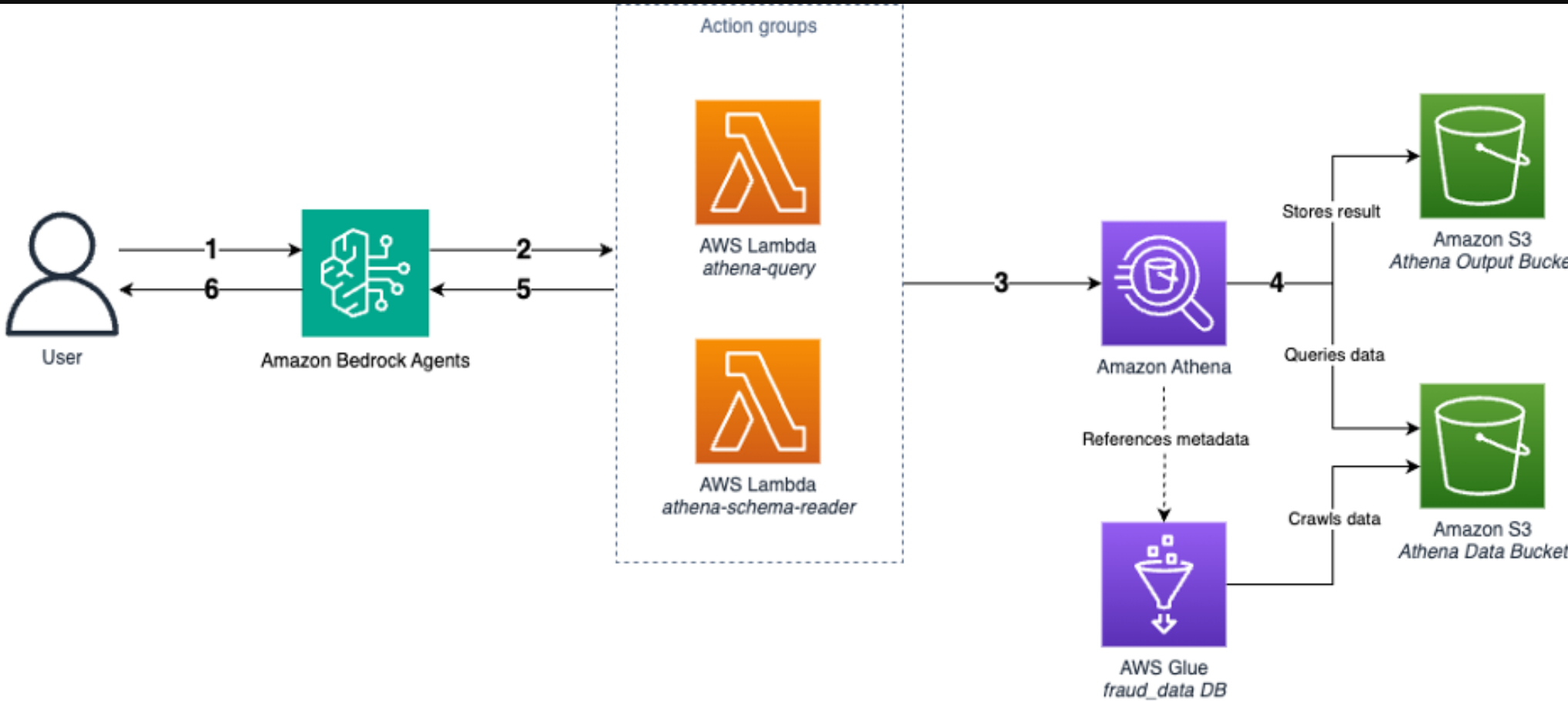 Amazon Bedrock Agents seamlessly manages the entire process from question interpretation to query execution and result interpretation, without manual intervention. It seamlessly incorporates multiple tools, and the agent analyzes and responds to unexpected results. When queries fail, the agent autonomously analyzes error messages, modifies queries, and retries—a key benefit over static systems.