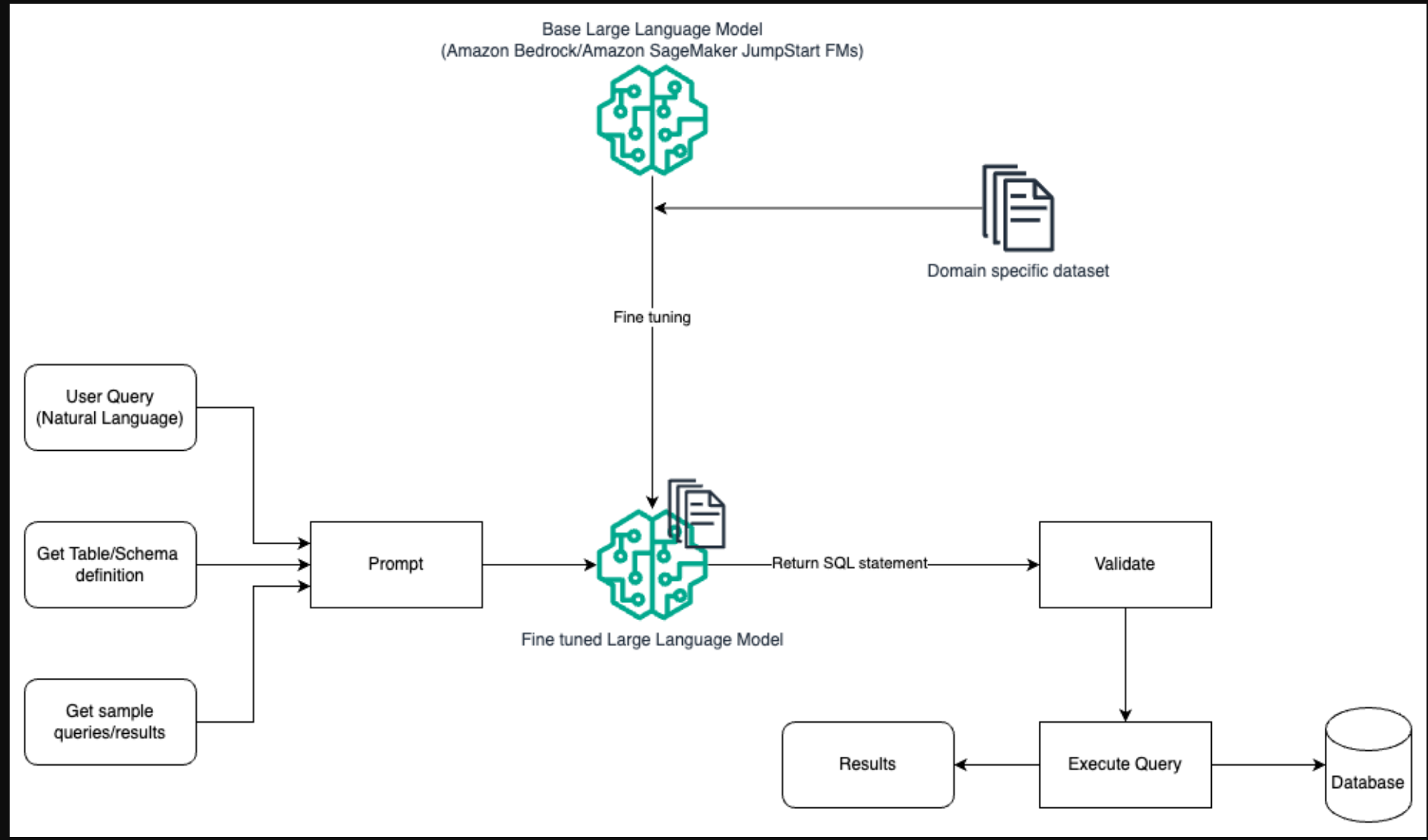 下图说明了使用快速工程和微调使用LLM生成查询的架构。