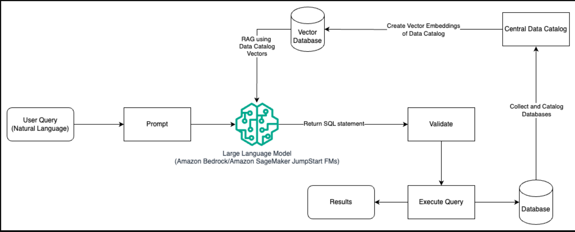 - 中央数据目录——创建集中式数据目录为组织的数据源提供了一个单一的窗格视图,并将帮助LLM选择适当的表和模式,以提供更准确的响应。从中央数据目录创建的向量嵌入可以与生成相关和精确SQL响应所需的信息一起提供给LLM。