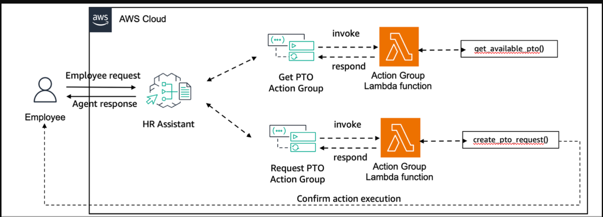 In this architecture, ROC is implemented at the action group level. When an employee interacts with the HR Assistant agent, the system requires explicit confirmation of all function parameters under the “Request PTO Action Group” before executing actions within the action group.