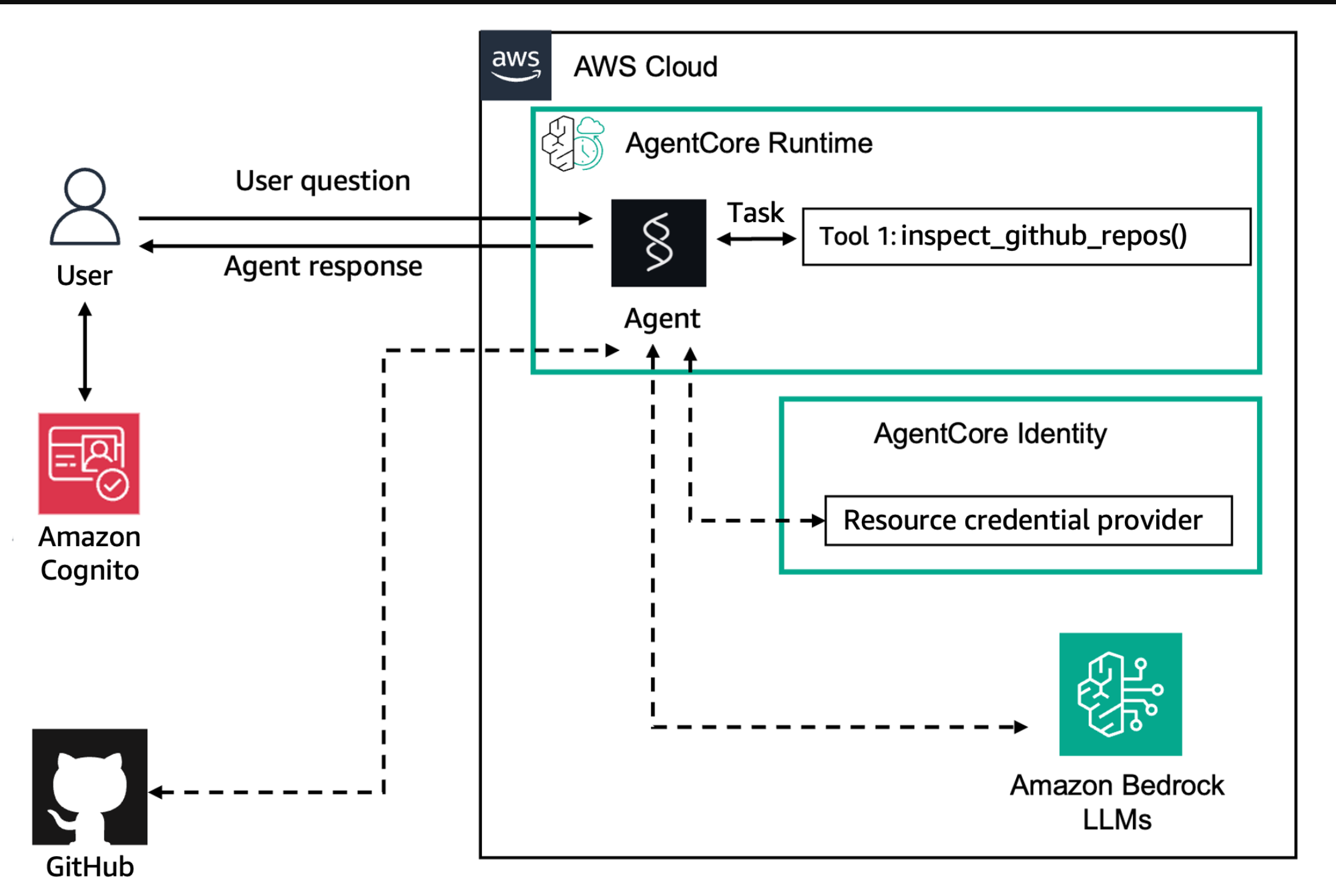 As you can see, the agent seamlessly authenticates users and accesses their GitHub repositories without exposing credentials or requiring manual token management. The entire OAuth flow, including user consent and secure token storage, is handled automatically by AgentCore Identity.