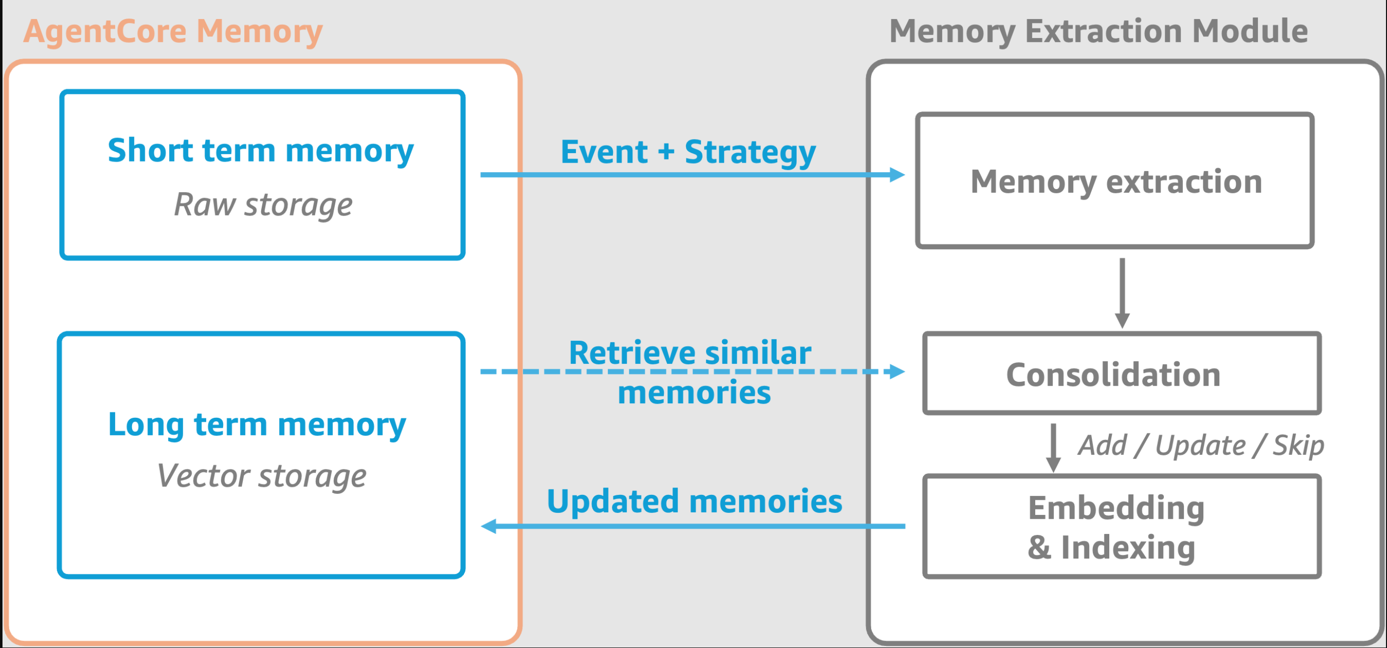 - Abstracted storage: AgentCore Memory handles the storage complexity for short- and long-term information, without requiring developers to manage underlying infrastructures.
