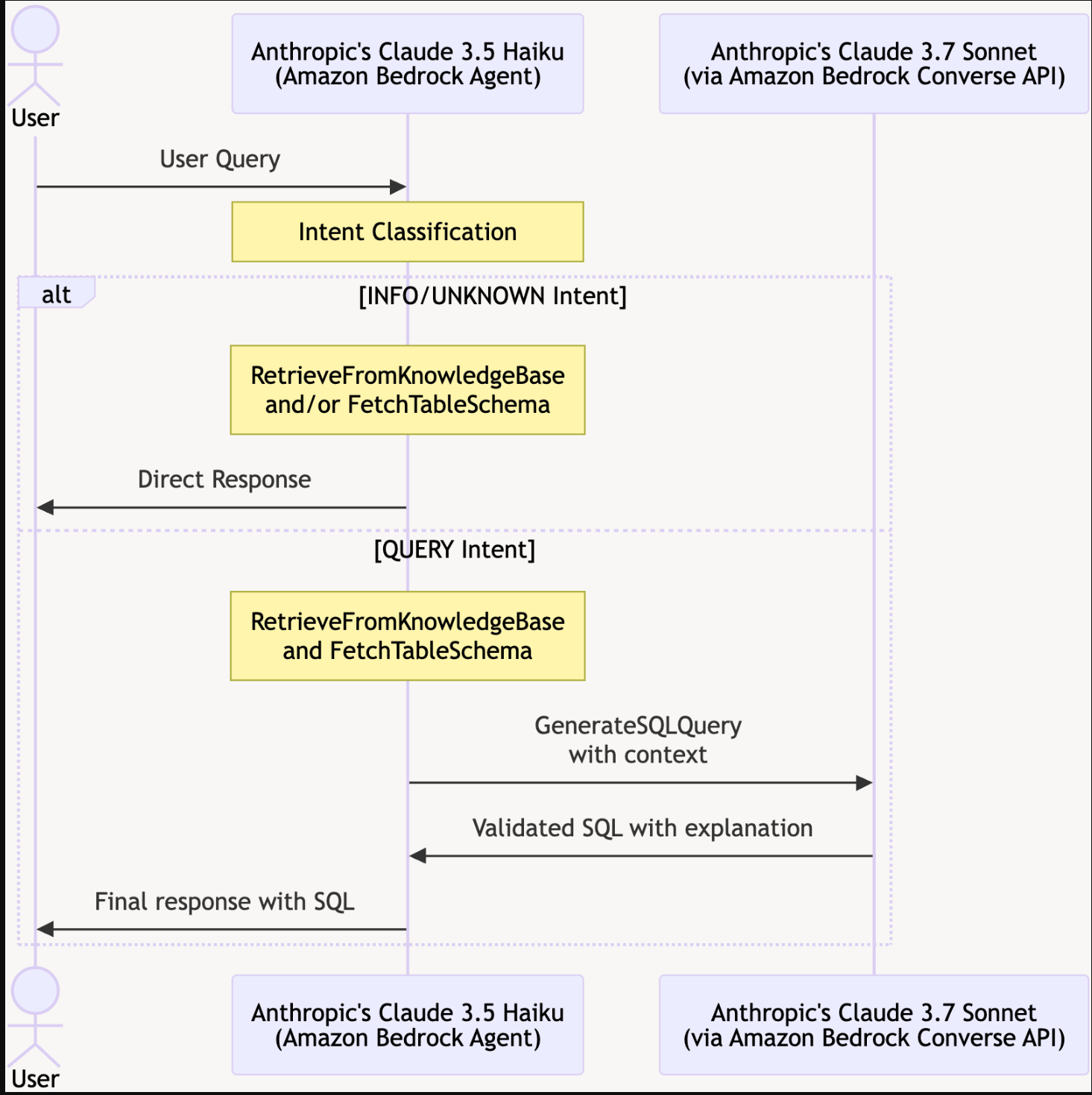 Sequence diagram illustrating RRDA’s hybrid model architecture where Anthropic’s Claude 3.5 Haiku orchestrates agent actions for fast retrieval and interaction, while delegating complex SQL generation tasks to Anthropic’s Claude 3.7 Sonnet.