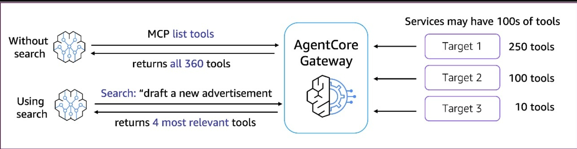 - Semantic Tool Selection – Intelligent tool discovery represents another core capability of Gateway. As organizations scale to hundreds or thousands of tools, discovering the right tool becomes increasingly challenging for AI agents. Moreover, when agents are presented with too many tools simultaneously, they can experience something called “tool overload,” leading to hallucinations, incorrect tool selections, or inefficient execution paths that significantly impact performance. Gateway addresses these challenges by providing a special built-in tool named