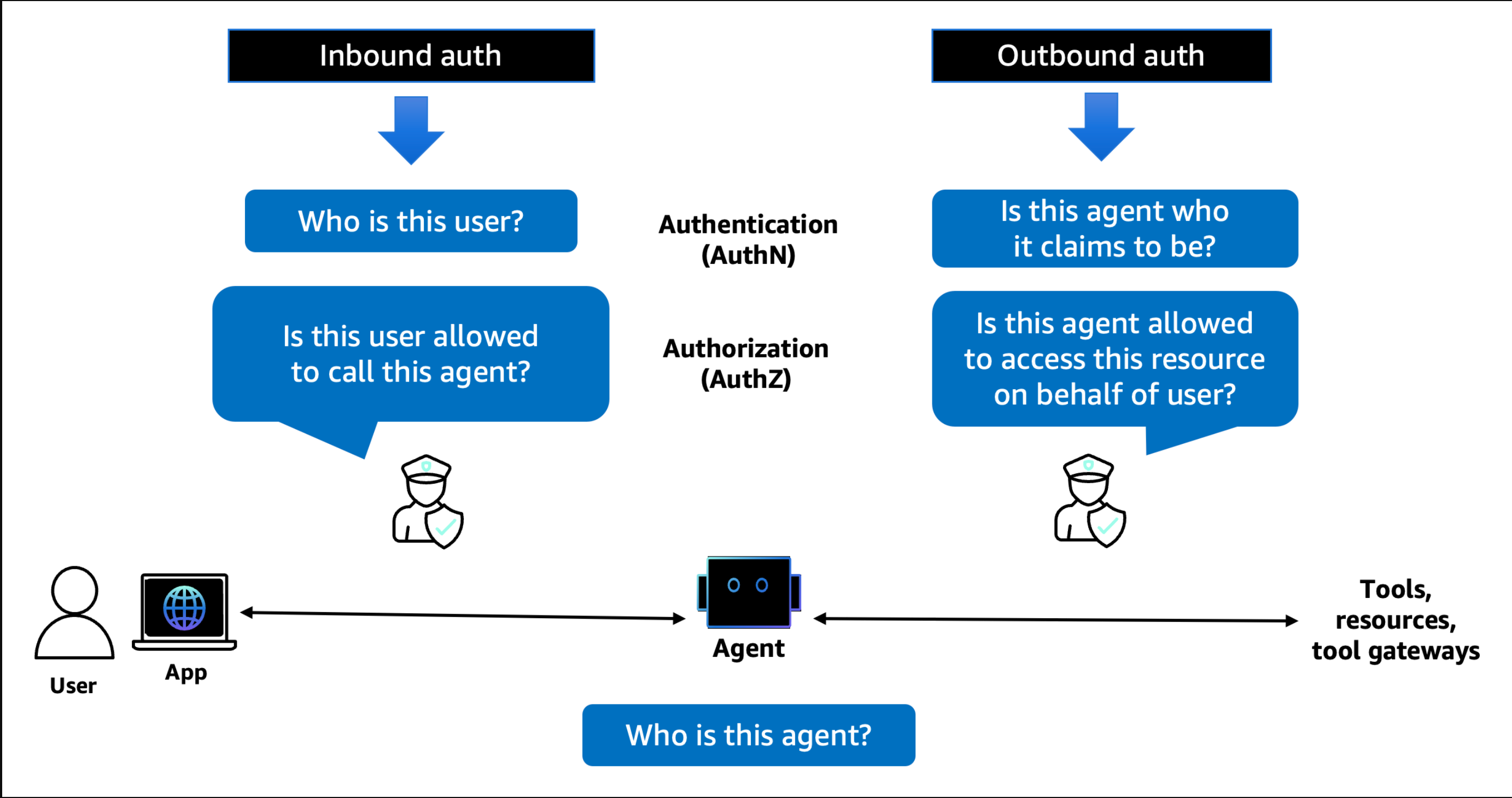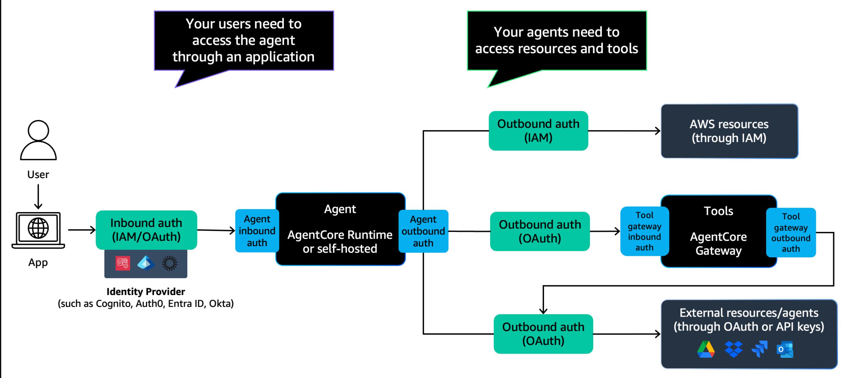 As organizations deploy AI agents into production environments, they face a critical challenge: how to securely manage identity and access at scale. Applications need to authenticate users for invoking AI agents, and these agents need to access multiple tools and services, maintain audit trails, and integrate with existing enterprise identity systems—all while avoiding data leakage and maintaining compliance with organizational requirements. These requirements become exponentially more complex when agents operate across disparate systems, act on behalf of different users, and need to access resources and tools in both AWS and external third-party services.