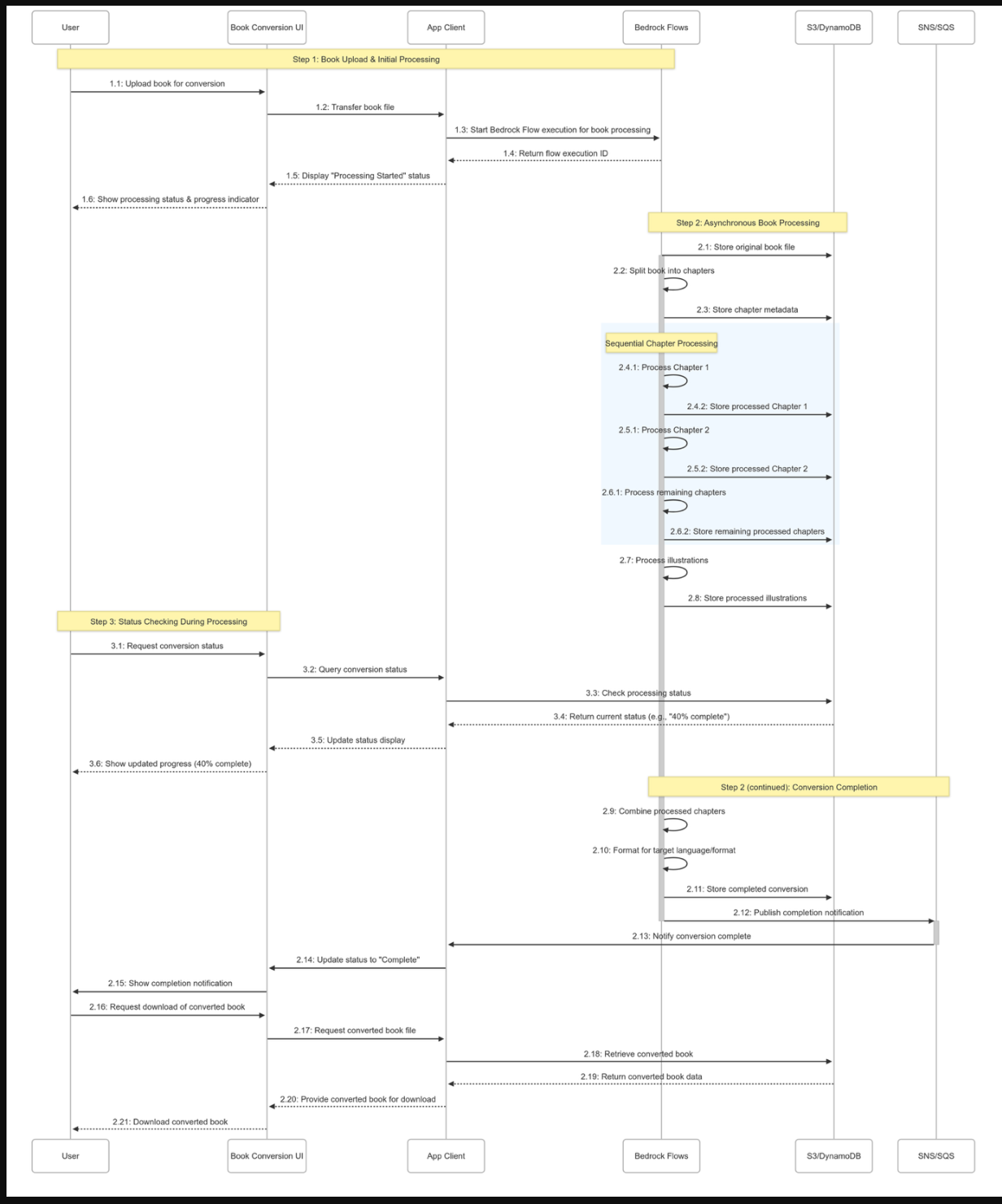 The following screenshot shows the high-level flow of Dentsu’s book conversion generative AI-powered application. The workflow demonstrates a sequential process from input handling through content transformation to final storage and delivery.