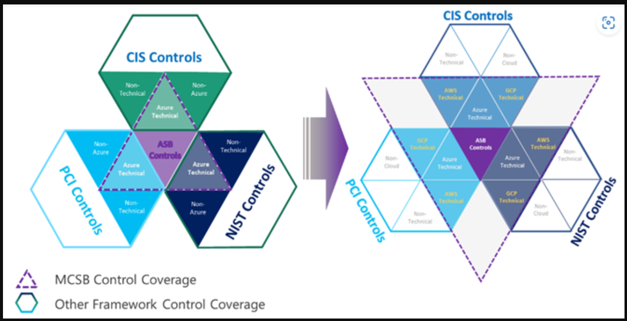 Comprehensive multi-cloud security framework: Organizations often have to build an internal security standard to reconcile security controls across multiple cloud platforms to meet security and compliance requirements on each of them. This often requires security teams to repeat the same implementation, monitoring and assessment across the different cloud environments (often for different compliance standards). This creates unnecessary overhead, cost, and effort. To address this concern, we enhanced the ASB to MCSB to help you quickly work with different clouds by: