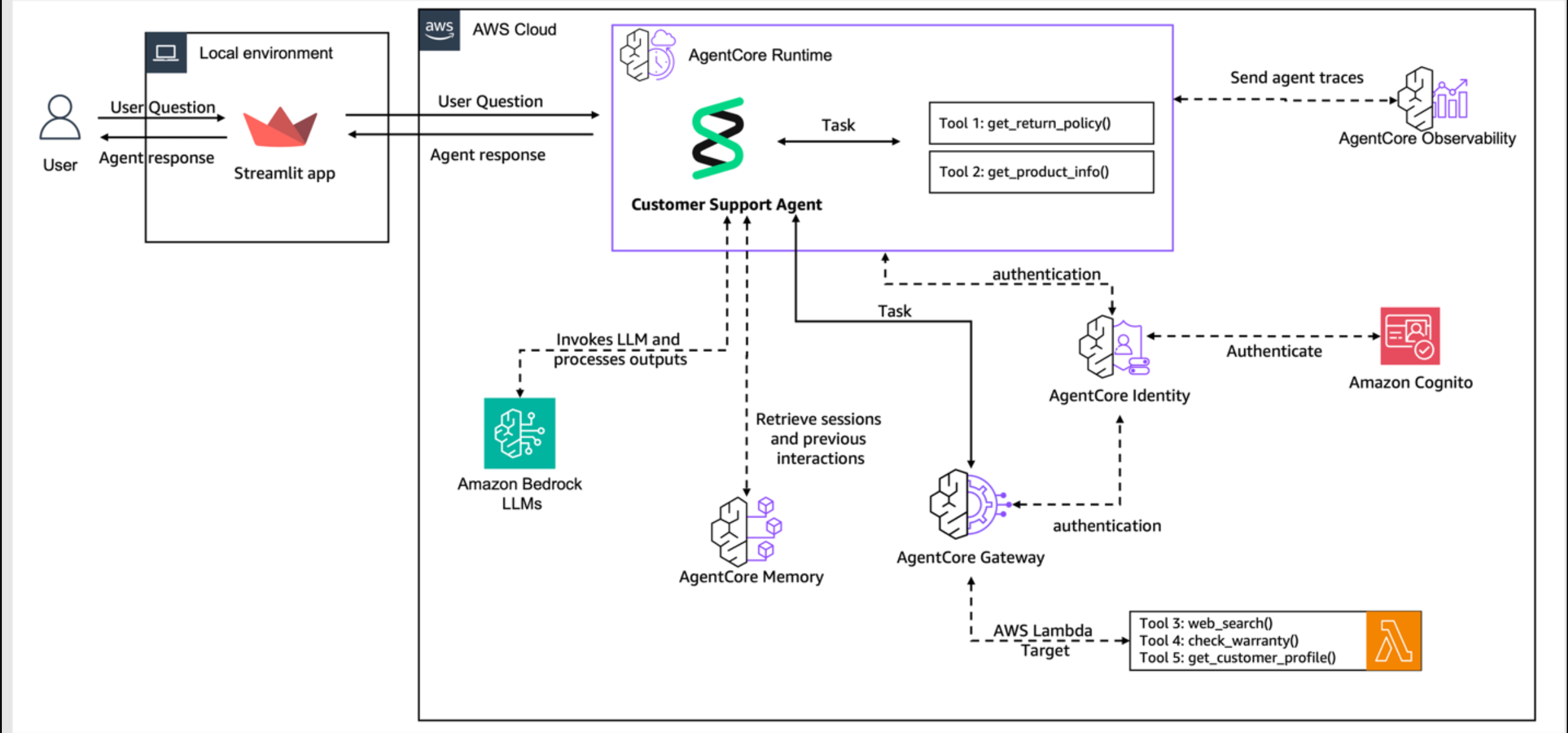In this post, we address each challenge systematically. We start with a prototype agent equipped with three essential tools: return policy lookup, product information search, and web search for troubleshooting. From there, we add the capabilities needed for production deployment: persistent memory for conversation continuity and a hyper-personalized experience, centralized tool management for reliability and security, full observability for monitoring and debugging, and finally a customer-facing web interface. This progression mirrors the real-world path from proof of concept to production, demonstrating how Amazon Bedrock AgentCore services work together to solve the operational challenges that emerge as your agentic applications mature. For simplification and demonstration purposes, we consider a single-agent architecture. In real-life use cases, customer support agents are often created as multi-agent architectures and those scenarios are also supported by Amazon Bedrock AgentCore services.