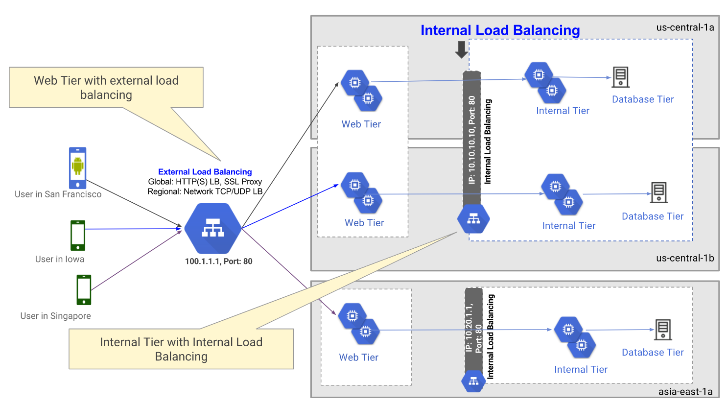 下图显示了一个外部负载均衡器,它在两个区域 us-central1 和 asia-east1 之间分配全球流量。它还显示了将流量从 Web 层分配到每个区域内的内部层的内部负载平衡。