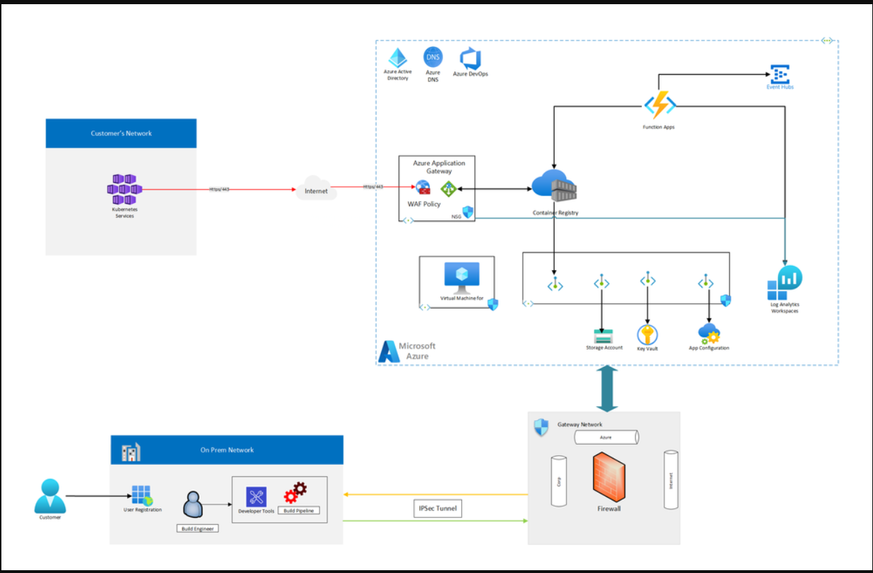 - Azure App Gateway: Azure App Gateway with WAF v2 is used to load balance and route traffic to Azure Container registry and provide Layer 7 connectivity to authenticate/authorize customer applications and download container images.