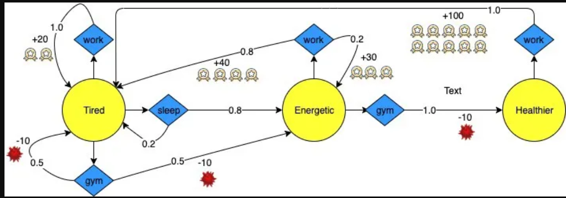如果他不想睡觉,他可能会去健身房锻炼。这给了他50%的机会进入精力充沛的状态,50%的机会保持疲劳。然而,他需要支付健身房的费用,所以这个选择会得到-10的奖励。