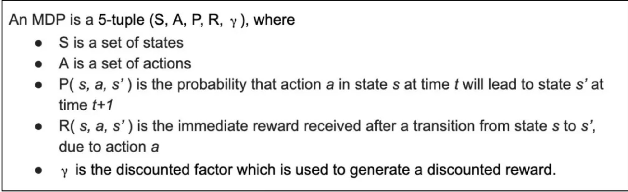 这是一个公式化的定义,如果你在谷歌上搜索马尔可夫决策过程,你可能会得到这个定义: