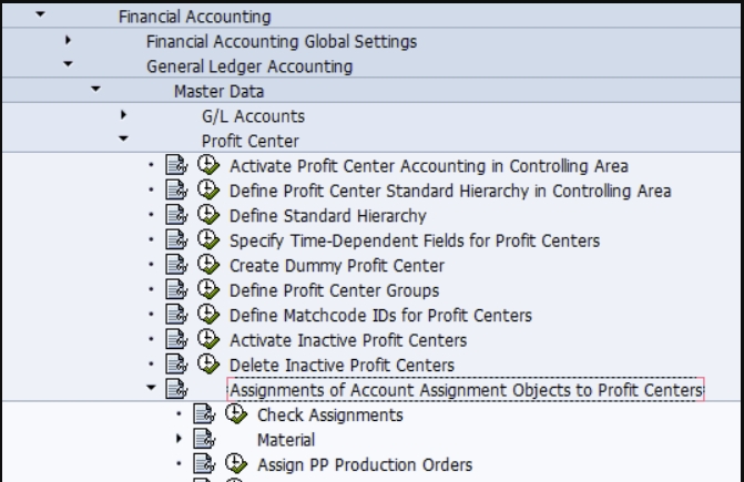 SPRO→ 总账会计下的财务会计→ 主数据→ 利润中心→ 将科目分配对象分配给利润中心。