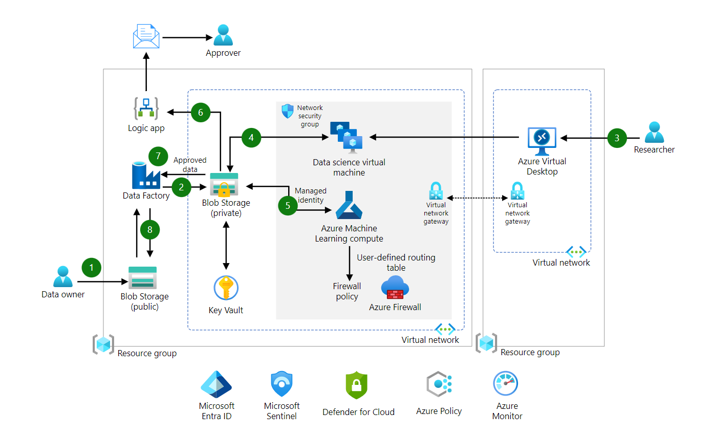 - 安全存储帐户中的数据集被提供给在安全网络环境中提供的数据科学虚拟机,用于研究工作。大部分数据准备都是在这些虚拟机上完成的。